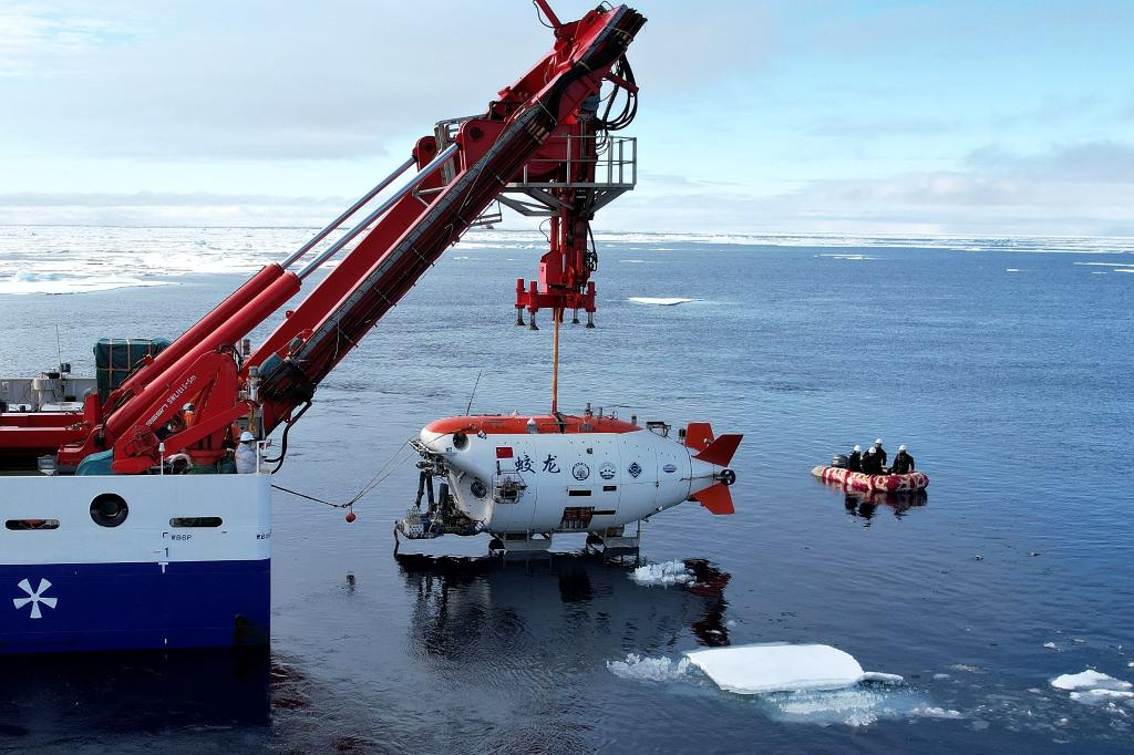 “蛟龙”号在北极冰区进行下潜。新华社记者刘诗平 摄