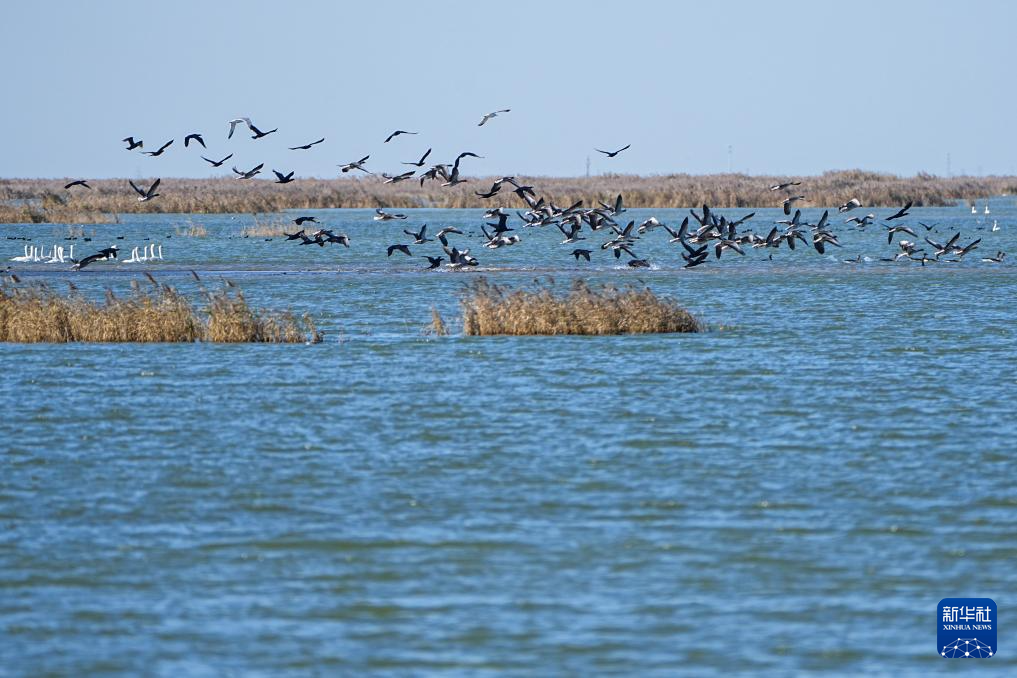 11月13日,在黄河三角洲国家级自然保护区,越冬候鸟在飞翔。