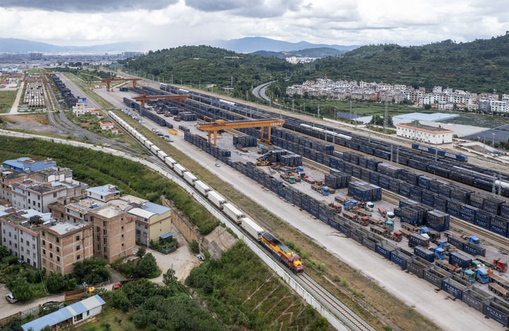 “郑和号”海公铁国际多式联运班列首发列车在昆明市腾俊国际陆港公铁联运中心等候发车(2025年7月4日摄)。新华社记者 彭奕凯 摄