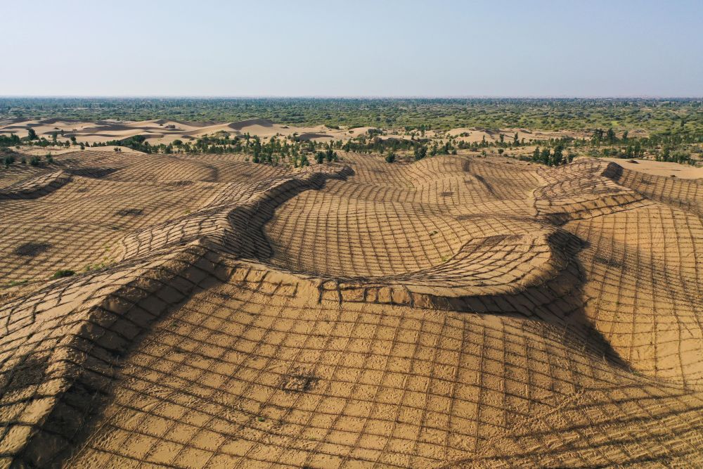 这是2025年9月12日在内蒙古鄂尔多斯市拍摄的正在治理中的库布其沙漠(无人机照片)。新华社记者 李志鹏 摄