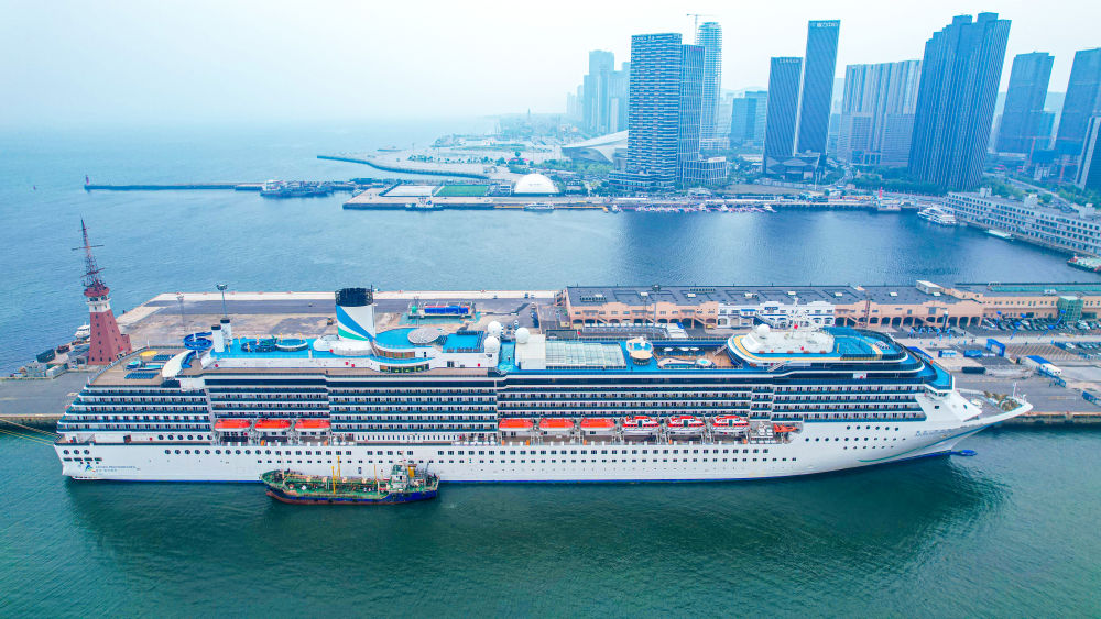 2025年5月27日拍摄的停靠在大连港国际邮轮中心泊位的“爱达·地中海”号(无人机照片)。新华社记者 潘昱龙 摄
