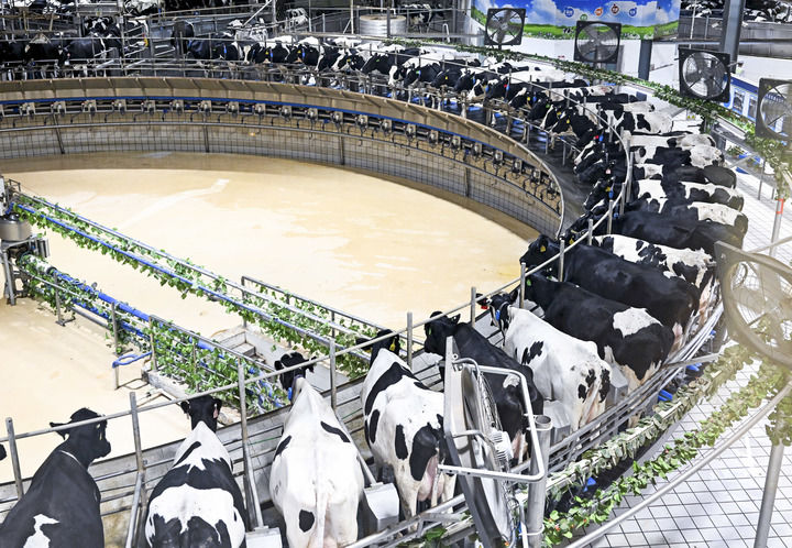 2025年7月28日拍摄的呼和浩特市伊利敕勒川生态智慧牧场挤奶车间。新华社记者 李志鹏 摄