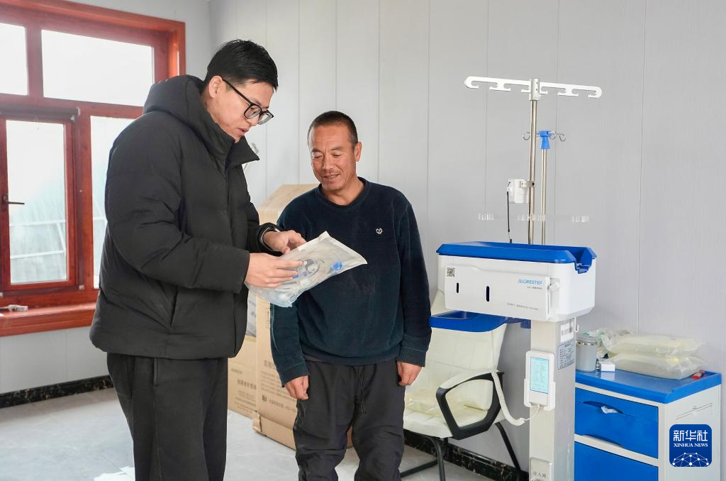2月2日,宁夏固原市原州区彭堡镇惠德村驻村帮扶工作队工作人员为村民马文军(右)讲解租用的医疗器械及配套耗材的使用方法。新华社记者 杨植森 摄