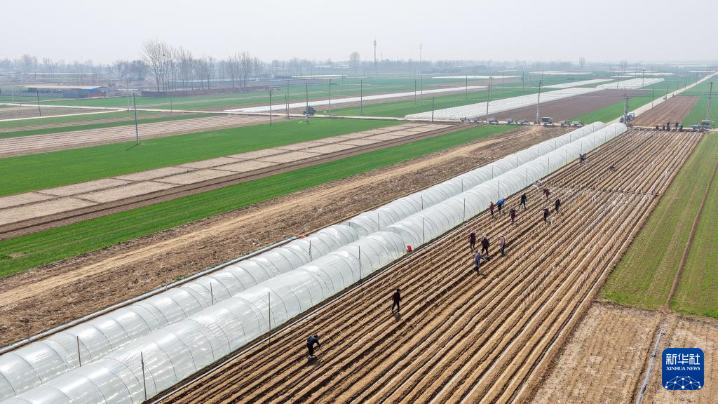 3月25日,河北省石家庄市行唐县南桥镇农民在田间搭设姜棚(无人机照片)。