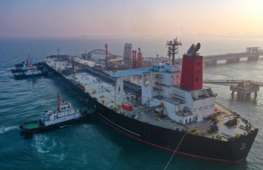2025年12月18日,一艘装载着17.9万吨石化原辅料的船舶泊入国投洋浦油储码头30万吨级原油泊位(无人机照片)。新华社记者 郭程 摄