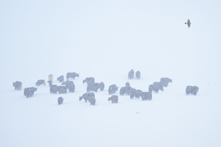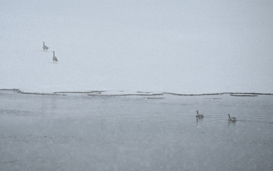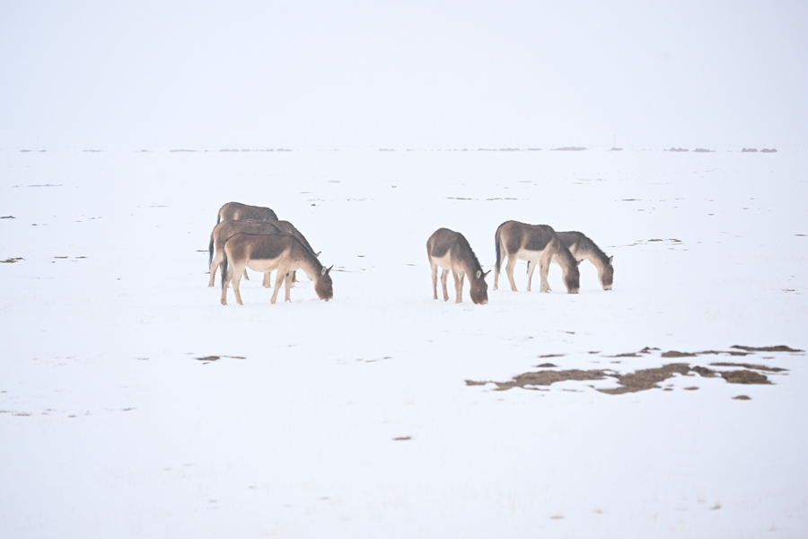 令人惊喜的是,风雪中的源头并不冷清。三五成群的藏野驴在缓坡上觅食,棕褐色的脊背上落满雪花,却走得从容不迫;几只藏原羚从远处跃过雪地,灵巧的身影在风雪中一闪而过,很快消失;斑头雁贴着湖面低飞,时而盘旋,时而凫水。这样的场景,在当地生态管护员看来,已不罕见。