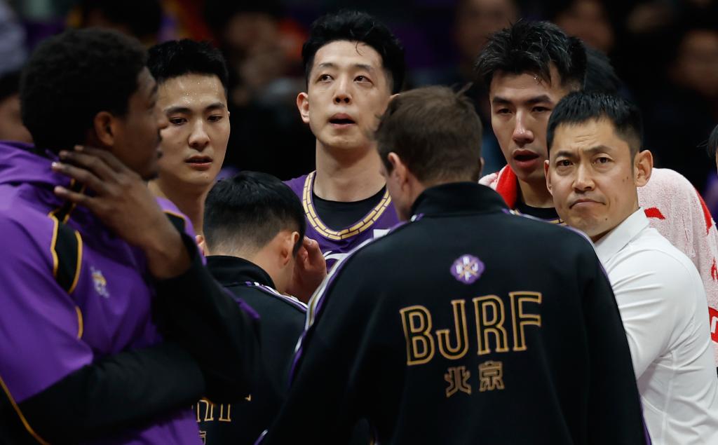 4月4日,北控队主教练张庆鹏(右一)在比赛最后时刻布置战术。新华社记者 王丽莉 摄