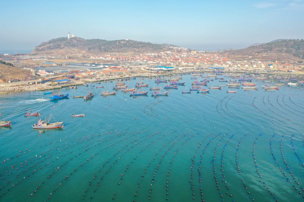 养殖工人驾驶船只在长岛海域养殖区内生产作业(无人机照片)。新华社记者 朱峥 摄