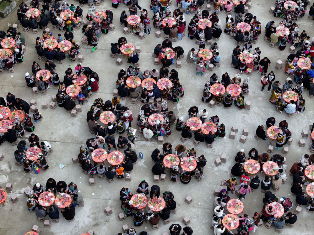 每年春节及春节前后,广西柳州市融水苗族自治县各乡镇村屯都会举办“坡会”,它是当地人交流感情、聚会娱乐的民间节日。每当坡会时,周边寨子男女老少身着节日盛装聚众集会,也吸引众多游客慕名而来,带动当地文旅产业发展。这是2026年2月21日,村民和游客在融水县杆洞乡党鸠村的坡会上共进“百家宴”(无人机照片)。