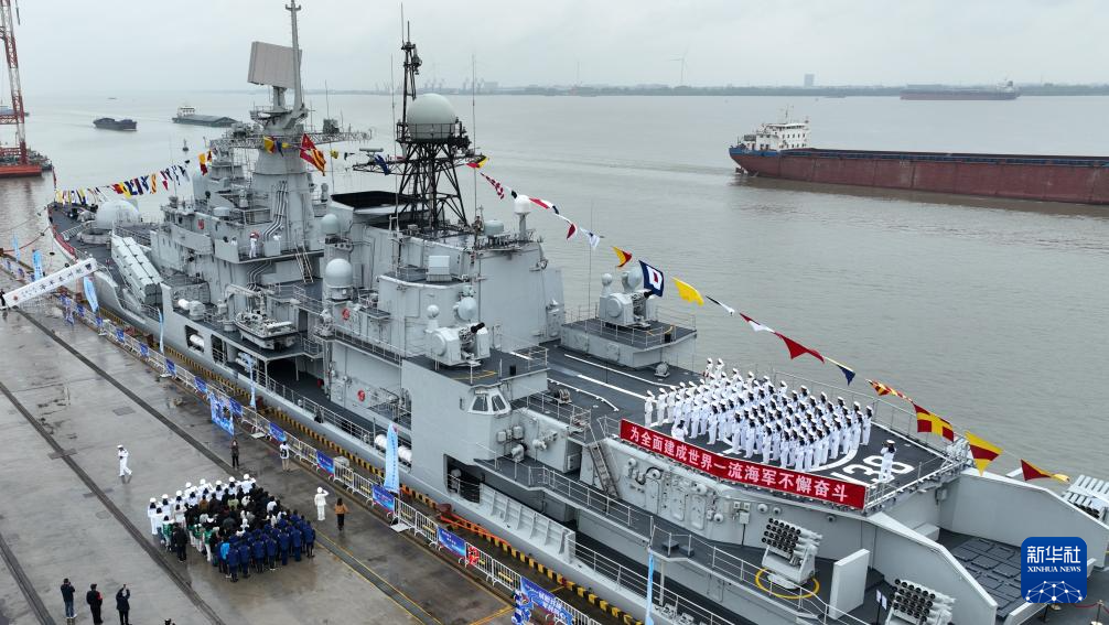 4月23日,在海军诞生地江苏泰州,海军泰州舰官兵举行升旗仪式(无人机照片)。新华社发(厚泽轩 摄)