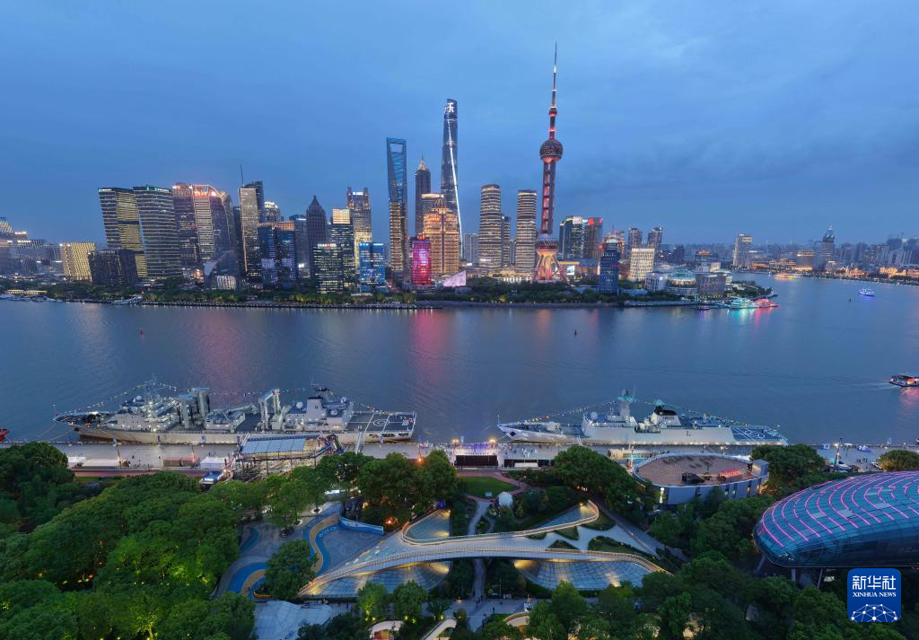 4月21日,海军阜阳舰、千岛湖舰在上海北外滩国际客运中心码头面向公众开放(无人机照片)。新华社发(孙巍 摄)