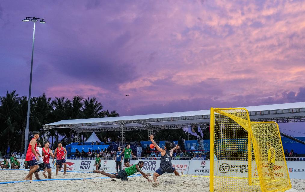 4月24日,在海南三亚举行的第六届亚洲沙滩运动会沙滩手球男子小组赛中,泰国队2:0战胜马尔代夫队。新华社记者 李博 摄